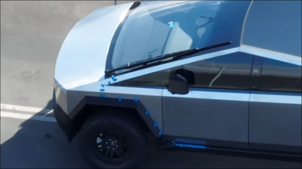 由於 Cybertruck 的前擋面積相當大,因此在這次亮相的 Cybertuck 我們也能看到採用一根超大尺寸雨刷。