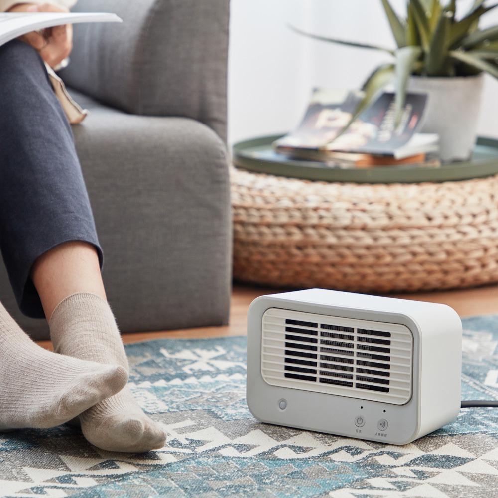 這款陶瓷式電暖器有智能偵測人體感知功能,材質以PTC陶瓷發熱、即開即熱,後側進風口可拆式活性碳濾網,降低異味同時也能過濾灰塵雜質,還有4.8小時強制關機的防呆機制,並採用阻燃塑料,提升安全性。