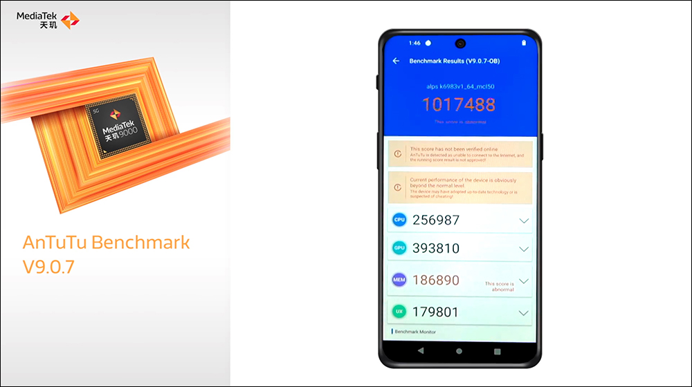 在昨(16)日,中國舉辦的「天璣旗艦戰略暨新平台線上發表會」除了進一步透露更多聯發科天璣 9000 5G 旗艦行動平台的更多內容,會後官方也釋出天璣 9000(Dimensity 9000)的各項官方性能跑分結果。其中天璣 9000 在安兔兔 V9.0.7 性能跑分得到 1,017,488 分的出色成績。