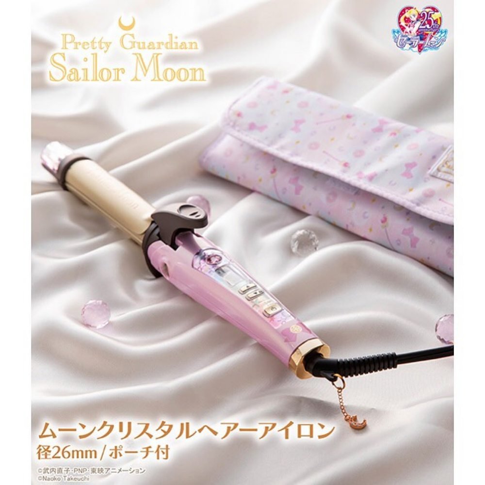 電捲棒的加熱處採用陶瓷塗層,精緻刻上「Sailor Moon(水手月亮)」字樣,握把處採幻彩設計,並以銀水晶、繽紛星月與「變身器胸針」圖案裝飾,尾端特別掛上新月吊飾,使用時液晶螢幕上還會顯示「水手月亮」的剪影,細節超精緻!