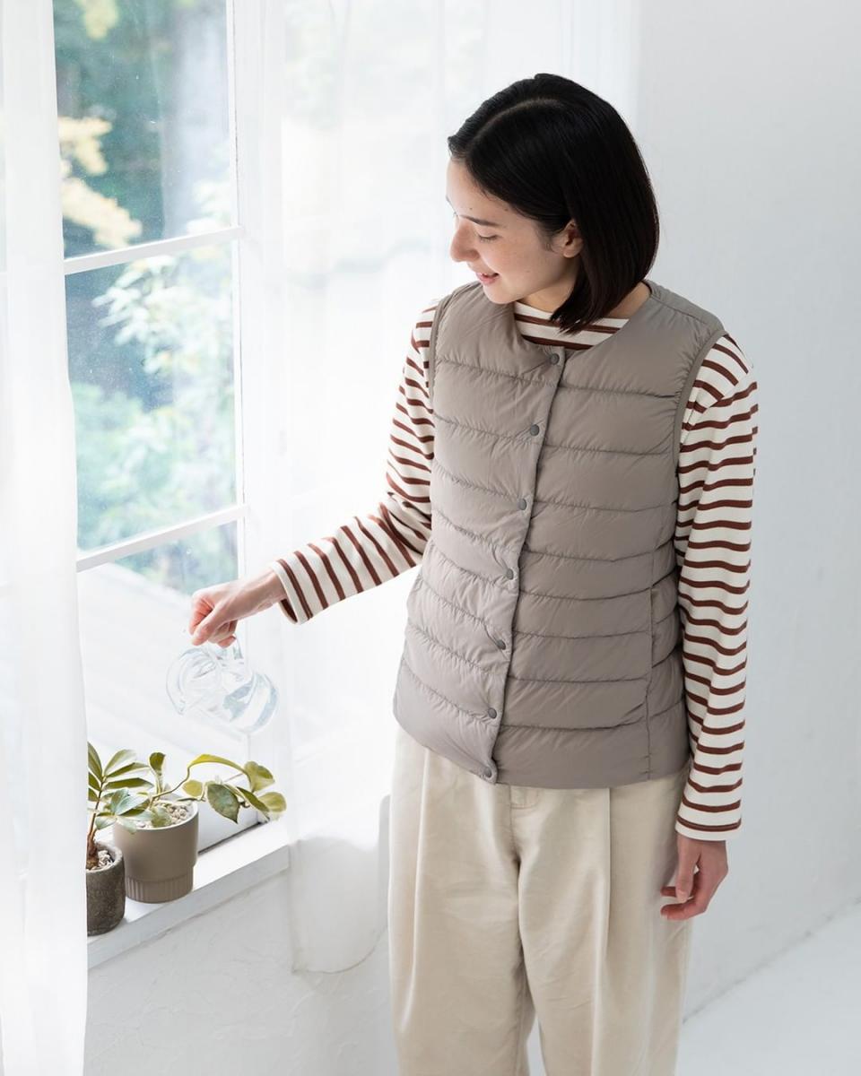 羽絨外套容易給人一種休閒感,因此進出辦公室的都會OL即便冒著感冒風險,也不願意穿羽絨服出門!因此貼心的Muji聽到了我們的心聲,推出能當作內搭的羽絨背心,薄薄一件讓你搭配在外衣裡面,到了假日還能搭配在睡衣外,讓你無論在室內或室外都不會著涼。