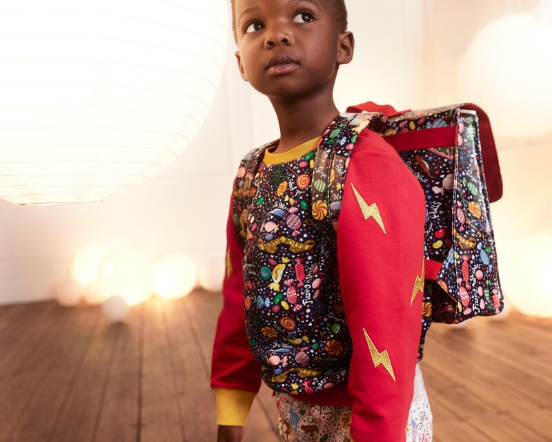 不論是書本或平板都能收納的後背包,點綴上哈利時常走訪的魔法糖果店中販賣的巧克力娃、柏蒂全口味豆、到薄荷蟾蜍、冰鼠。
