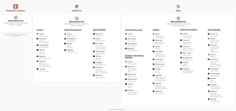 還記得那個曬出 Chrome 瀏覽器還有 Google app 所索取 iOS 隱私資訊,並直接拿自家行動瀏覽器在「會與你連結的資料」中取用權限「掛蛋」表現的截圖對照,藉此突顯自己重視隱私核心價值的 DuckDuckGo 嗎?這個提供包括私密搜尋、追蹤器封鎖與網站加密功能,號稱「永不儲存你個人資料」極度重視私密隱私的搜尋與瀏覽器應用開發商。選擇在自己 2021 年終的里程碑大盤點文章裡,揭露接下來針對桌面系統的計畫。