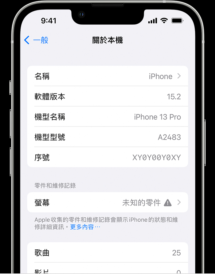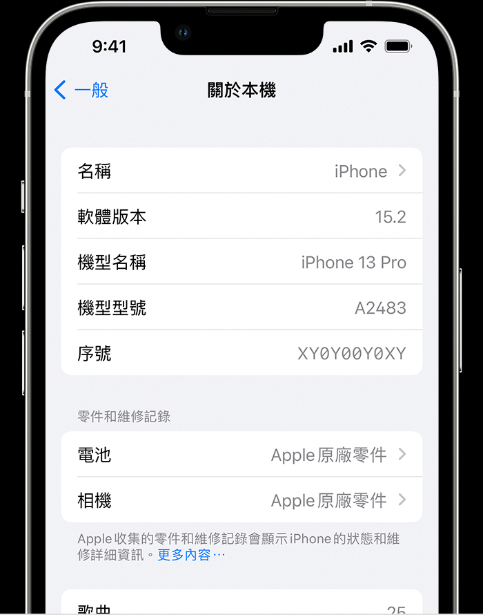 拿到一部 iPhone 手機,只要升級到 iOS 15.2 以上的版本,你可以直接從「設定」應用程式選擇「一般」然後進入「關於本機」裡面查看關於這部 iPhone 的零件更換與維修記錄;如果電池、顯示器或相機未經更換,則不會在關於本機裡面看到零件和維修記錄: