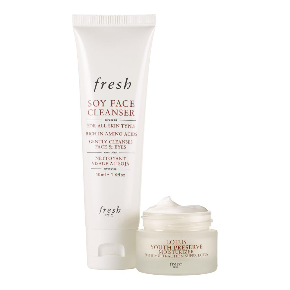 這是一套非常暢銷的臉部保養旅行組合,每天早晚都可以使用,大豆潔面乳幫助肌膚洗去雜質,但不會造成脫屑問題。蓮花青春保濕霜能同時鎖水補水,減緩老化及改善乾燥問題。