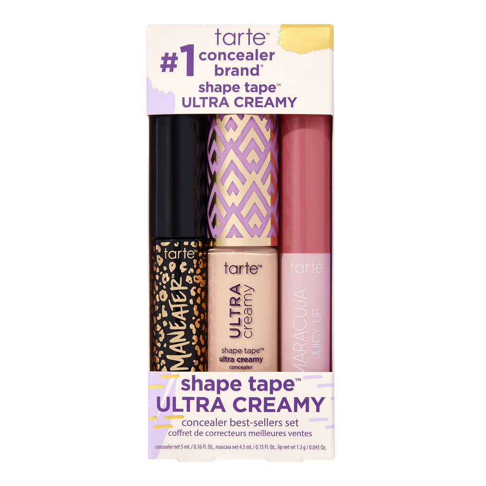 這款彩妝組包含美國最暢銷的24 小時保濕功能全遮瑕膏 Shape Tape Ultra Creamy Concealer,增加睫毛長度及捲曲度的Maneater 睫毛膏,還有Maracuja Juicy Lip in Hibiscus 純素潤唇膏。