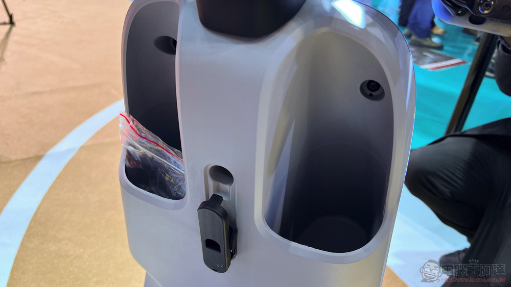 將目光延伸往下看到超大杯架的下方,則是可以發現 Ai-4 也透過曲面內凹的線條,讓腳踏空間可以更往前延伸一些,藉此造就更好置放物品的「全平面」置腳空間。