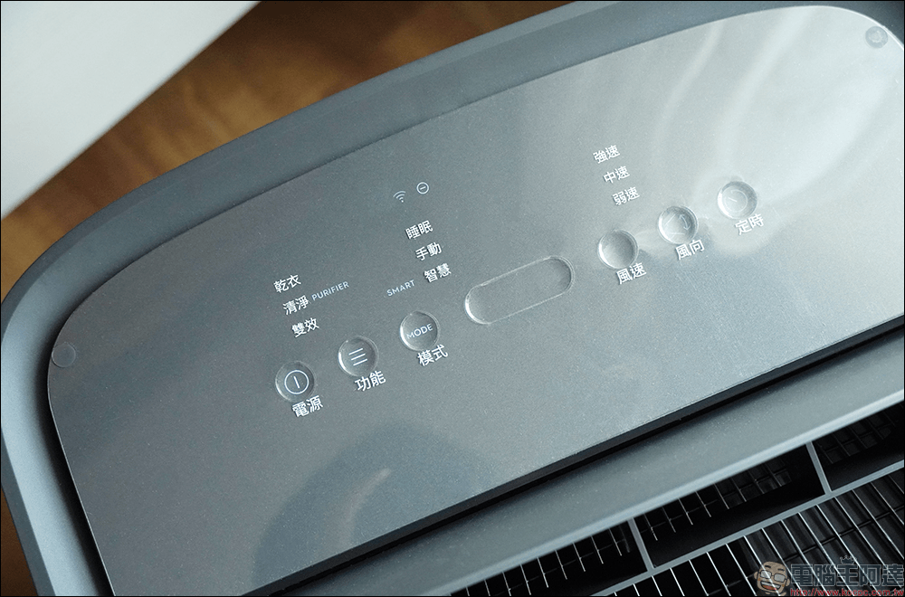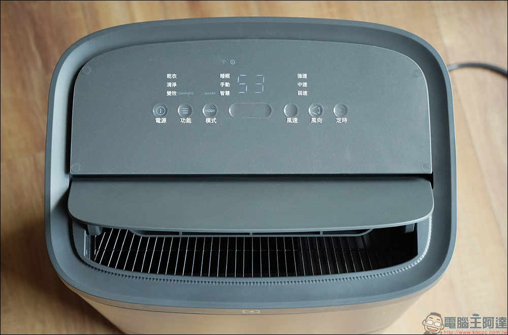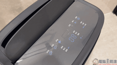 接著看到伊萊克斯極適家居700 清淨除濕機頂部的操作面板,整齊排列的功能列表和觸控按鈕以簡單明瞭的方式呈現,讓使用者即便初次操作也能很快上手。