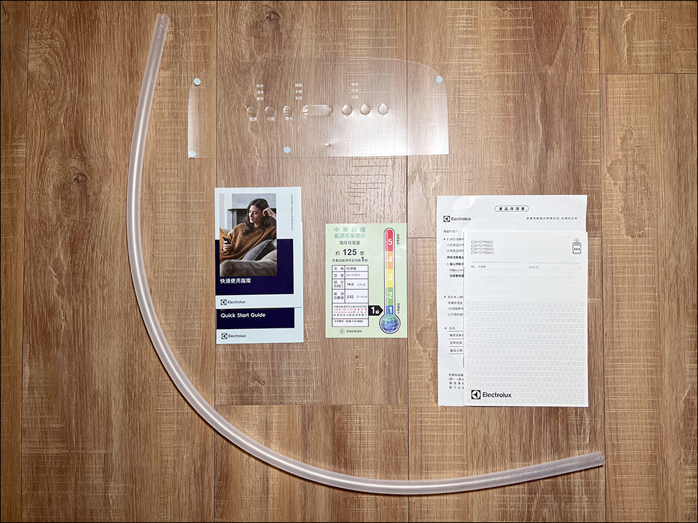 伊萊克斯極適家居700 清淨除濕機的配件如下,包括產品使用說明與保證書、快速使用指南、一級能源效率標章、排水管和中文面板貼膜。