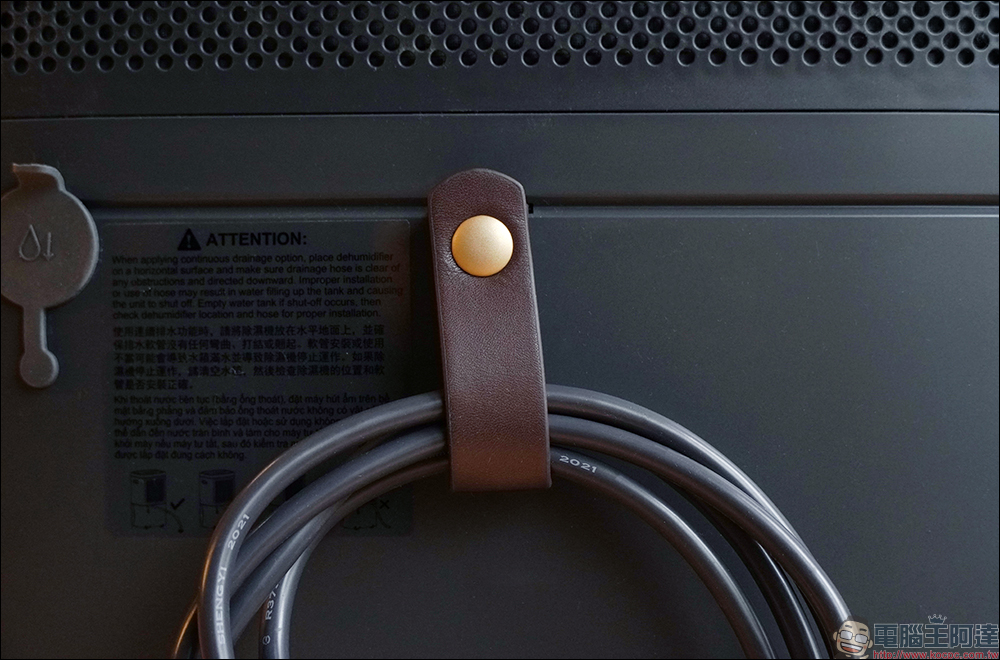 北歐設計以人為本的人性化設計,也體現在一些設計的小細節上。像是伊萊克斯極適家居700 清淨除濕機的機身背面,就設計了皮革材質的電源線環扣,讓收納電線更整潔美觀。眼尖的人或許還能發現,機器的電源線、萬向輪等處的顏色皆採用與機器相同的灰色,種種地方都能見到其他在日系、韓系或美系品牌較難看到的設計巧思。