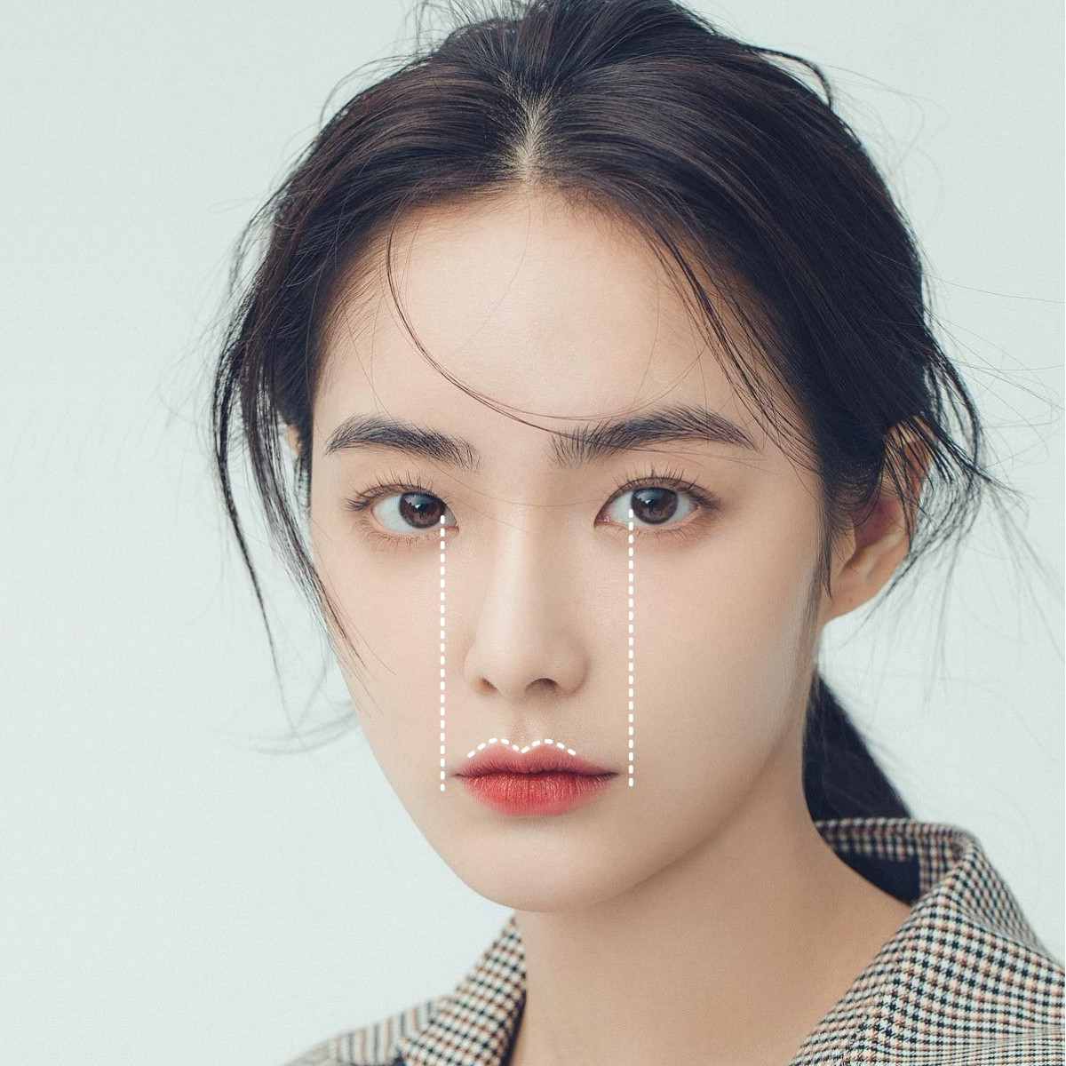 嘴唇寬度:瞳孔內側垂直往下延伸是標準唇寬,如果你的唇寬小於標準就是圓唇(A),大於或等於標準則是寬唇(B)。
