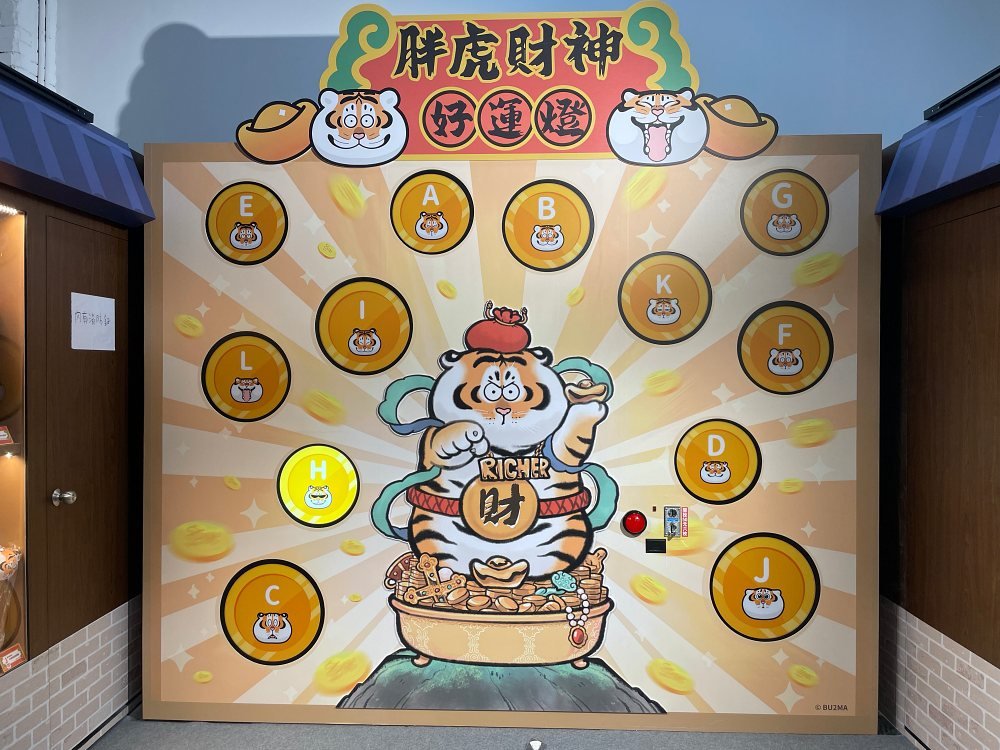 旗艦快閃店除了2.5公尺高的猛虎氣偶,還有必拍也必玩的巨型扭蛋機。特別以化身「財神」的胖虎搭配金元寶為造型,每顆扭蛋皆放入物超所值的週邊,中獎機率百分之百,記得趁機試手氣。
