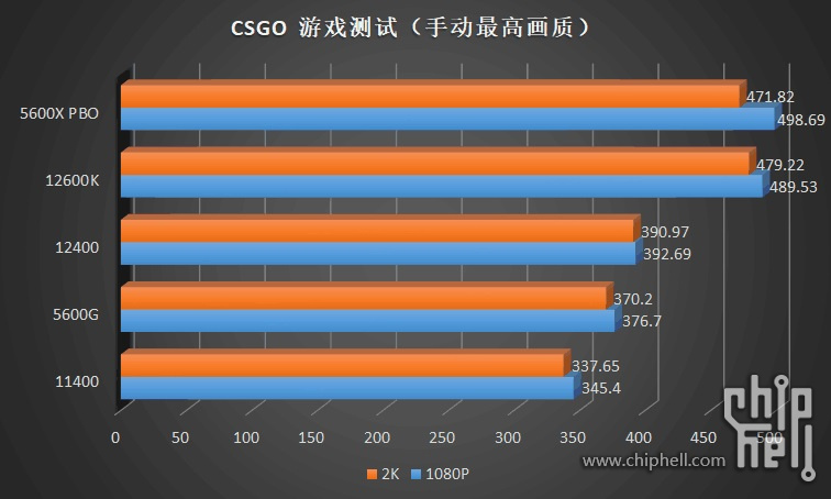 CS:GO 遊戲實測,12400 測得在 2K 畫質中,獲得 390.97、1080P 也達到 392.69: