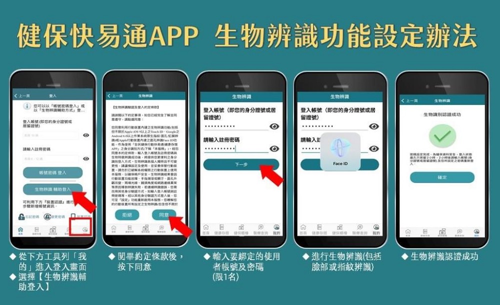目前已提供更新的「全民健保行動快易通」APP,一大特色是新增「生物辨識輔助登入」,過往每次登入APP都要輸入,現在可依使用者所持有行動裝置預設功能,透過「人臉辨識」或「指紋感應」進行身分驗證及登入,且與現行帳號密碼輸入機制並行,而這些特徵值皆留存在手機上,並不會傳送到健保署,健保署不會收載使用者的生物特徵值。