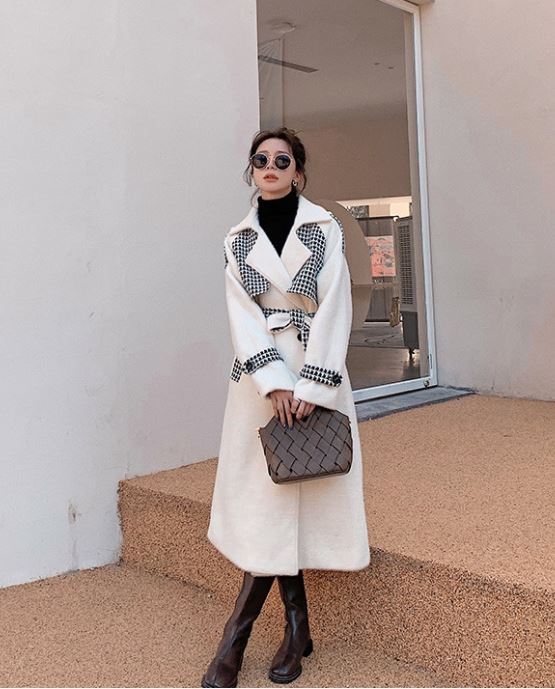 說到寬鬆的直筒大衣就會想到韓劇女主角,簡單的高領、馬靴搭上長大衣,就完成優雅的韓風造型。這款毛呢大衣在剪裁上也很別緻,領口做了波浪造型外,更拼接了秋冬也很流行的千鳥紋,讓素色大衣穿搭有了不同的詮釋,而毛呢材質不需穿太厚的內搭就很保暖。