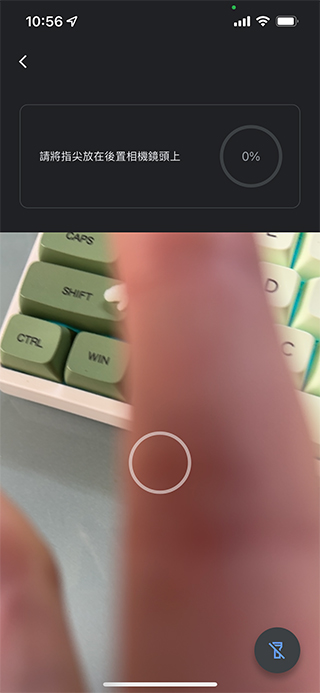 - 接下來就要進入測量啦!螢幕上面會出現相機鏡頭的預覽窗,提示你要將指尖放到手機後置鏡頭上,至於要放哪一顆,可以從預覽窗裡面有沒有被手指填滿得知。手指放上去後輕輕地向下壓,靜止不動 30 秒即可。