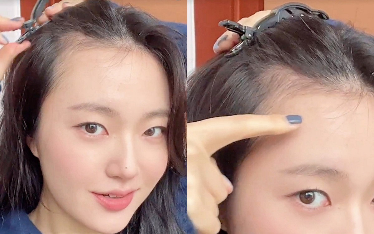 首先先將額頭前髮際線部位的頭髮往上撩起後、用髮夾夾起來,會看到髮際線旁有一些碎髮。