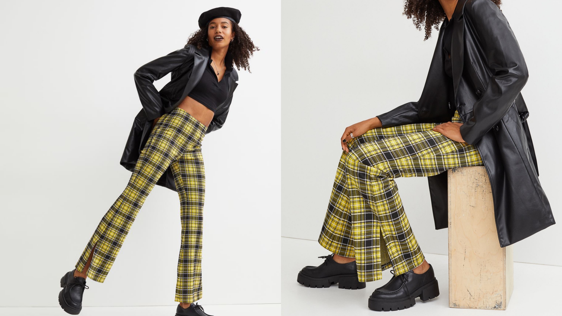 想穿格紋褲出門卻怕被當成睡褲嗎?要避免這樣的狀況,只要挑選有曲線感的褲型就沒問題了!例如 H&M 的開衩爵士褲,微喇叭的版型加上後開衩設計,不只為整體造型增添了復古玩味,還能讓腿看起來超瘦超長,難得一見的完美神褲,真的可以直接下單了。