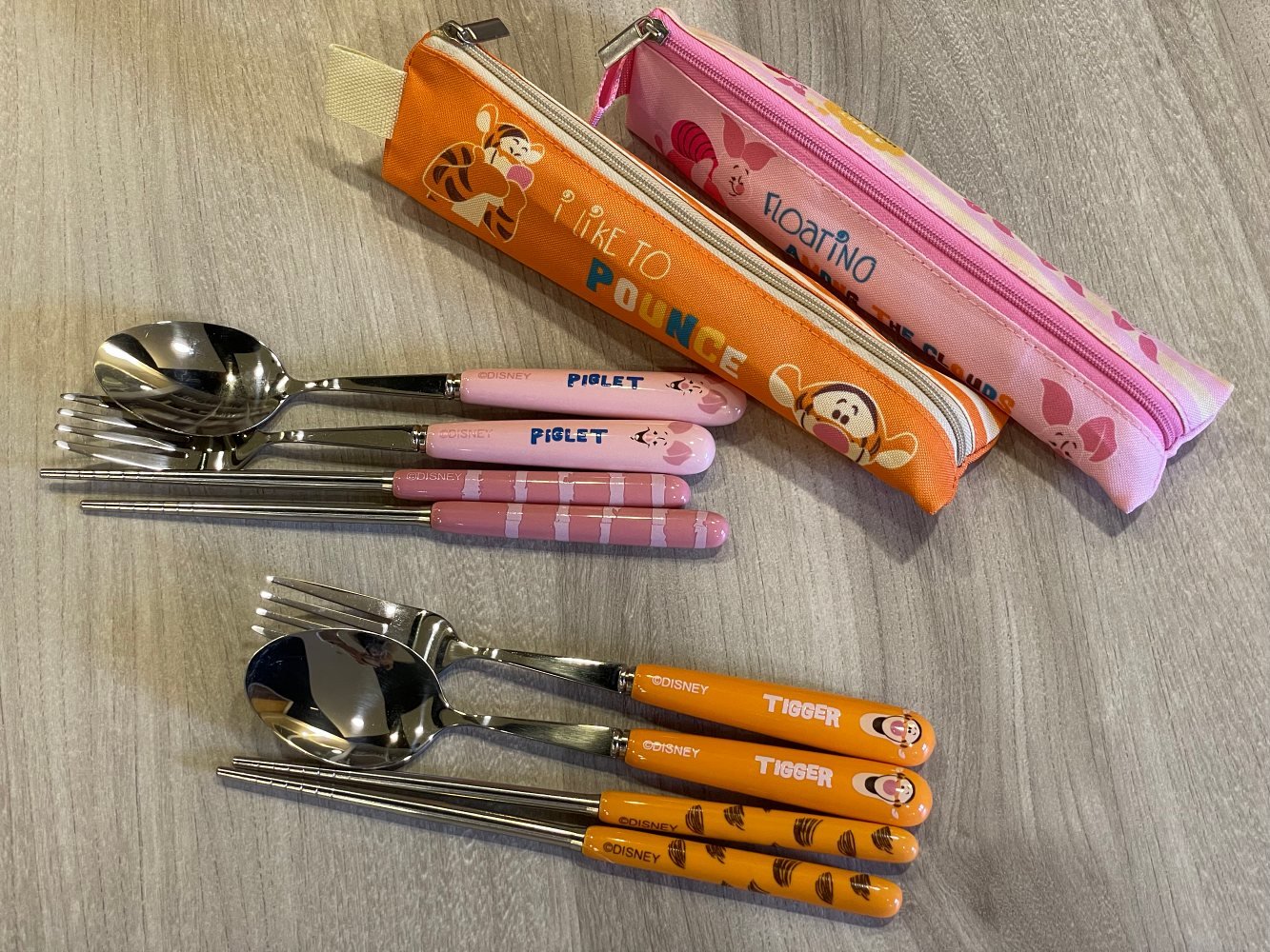 外出週邊還推出「餐具組」與「提袋」,同樣以跳跳虎、小豬為主角。餐具組內含筷子、湯匙與叉子,隨附贈角色收納袋;提袋是「保冷袋」與「收納袋」的組合,兩個願望一次滿足!