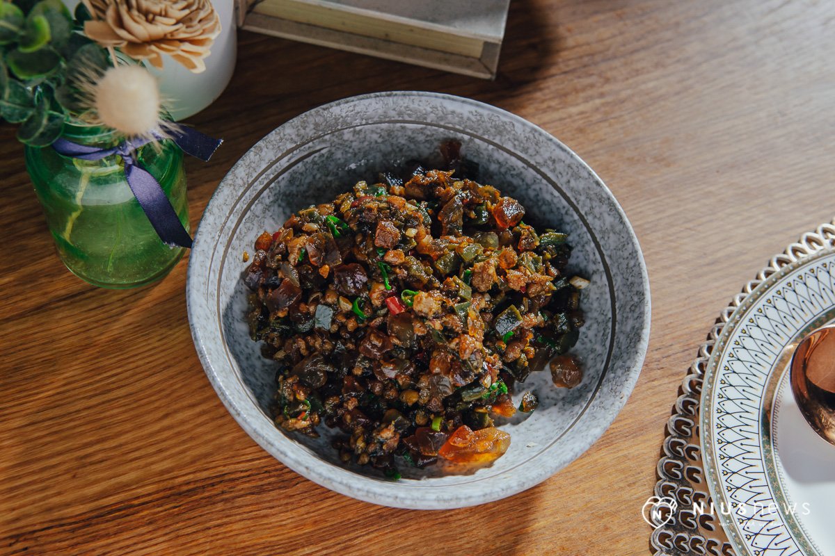 再來是妞編輯非常喜歡的一道菜「川椒香辣皮皮挫」!妞妞們吃過蒼蠅頭嗎?這道菜就是皮蛋版本的蒼蠅頭,利用青、紅兩款辣椒去增加辣味,再配合醬油、蠔油和花椒,綜合成一到又麻又下飯的料理,剛吃下去會感受到鹹香和皮蛋的風味,尾韻的辣味最後竄升出來,超級爽啦~