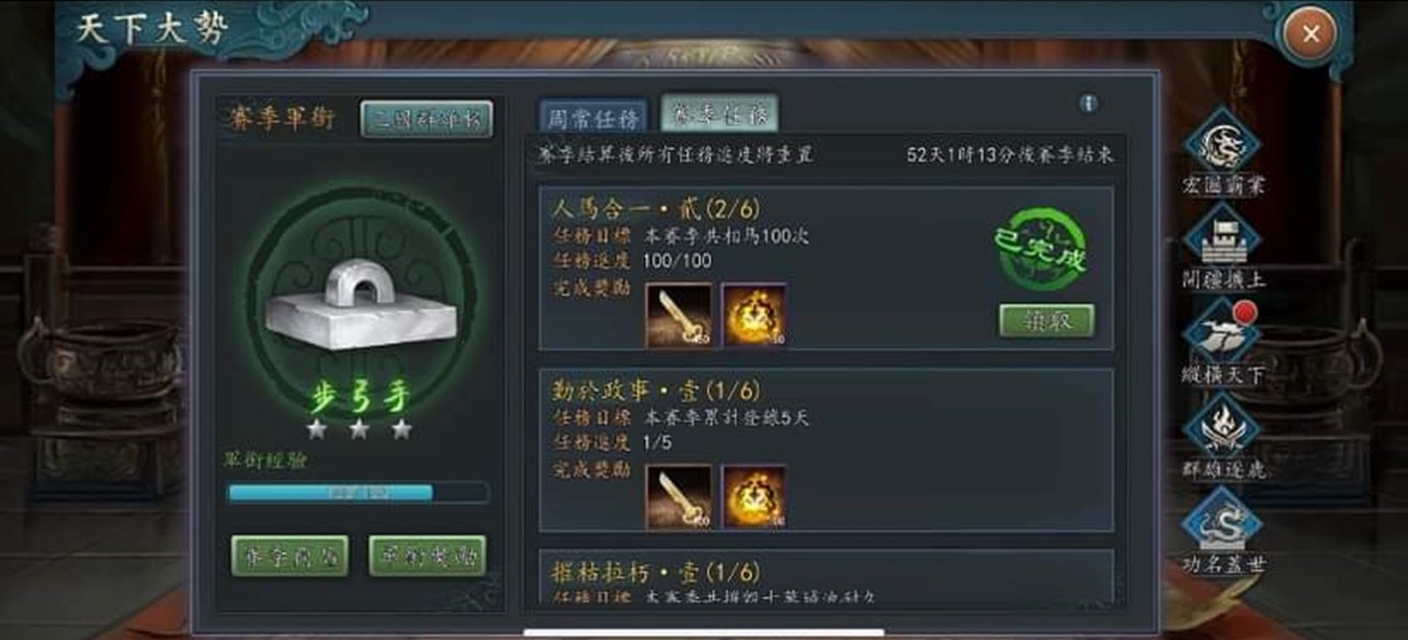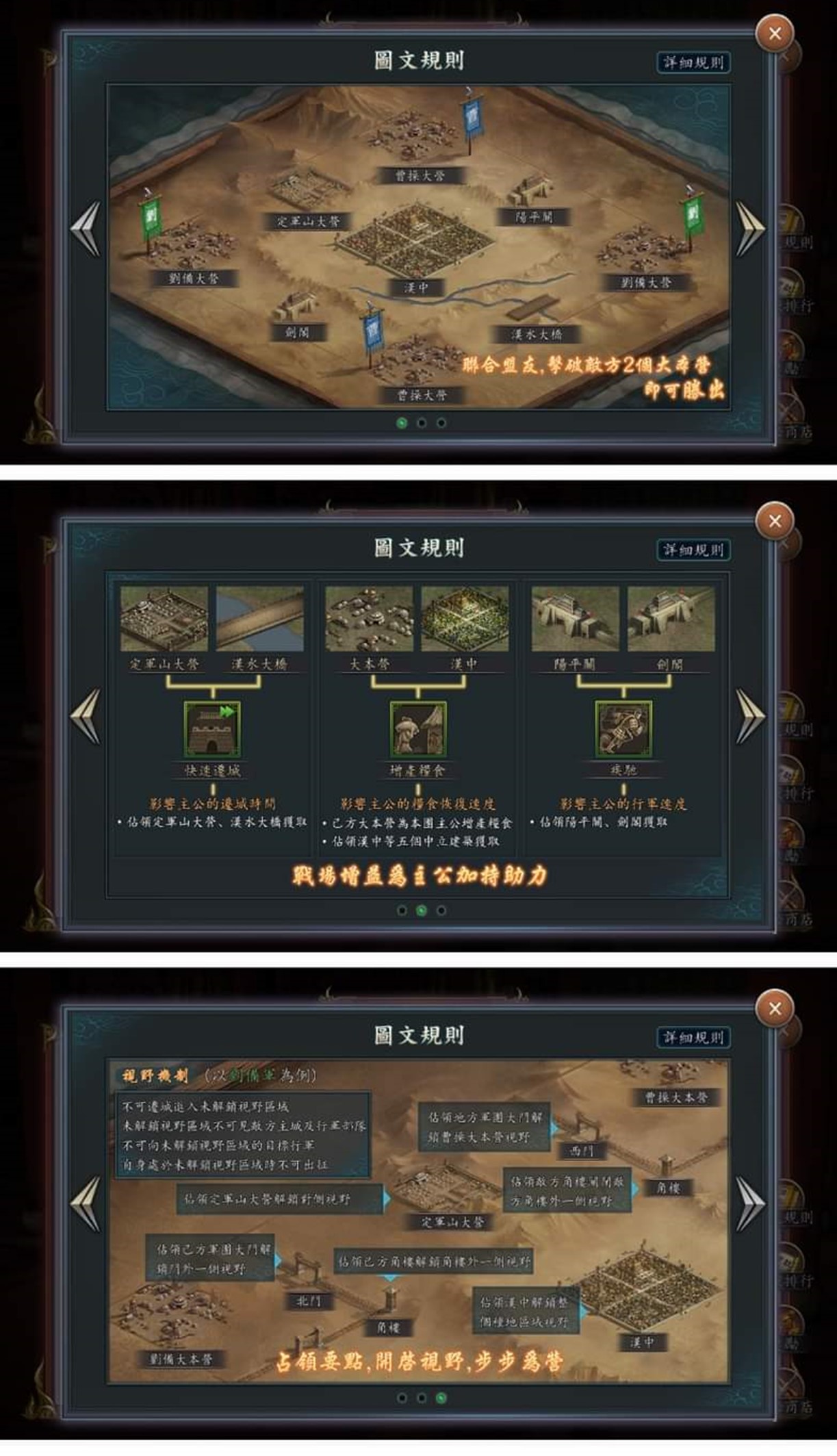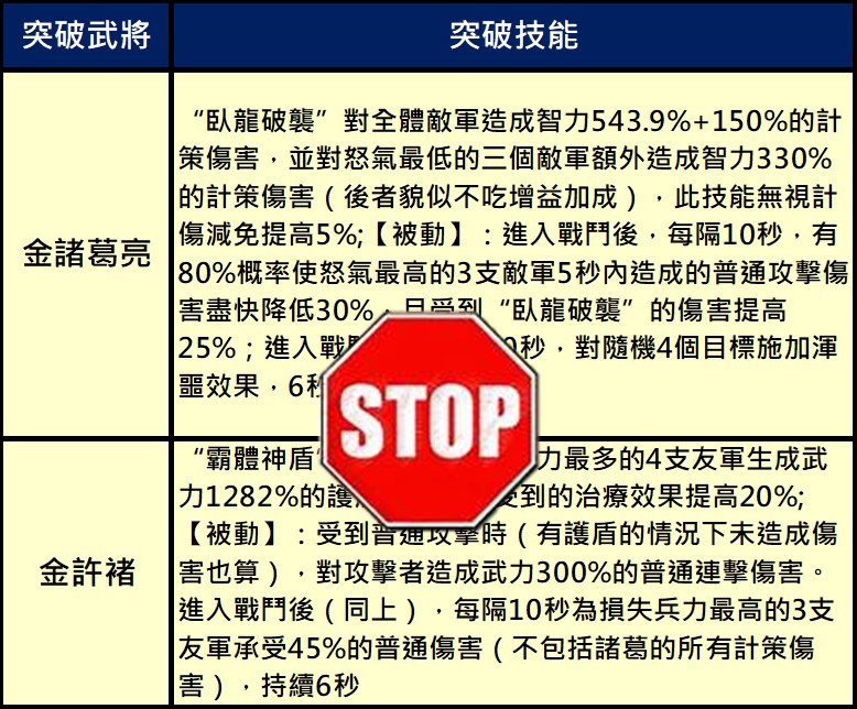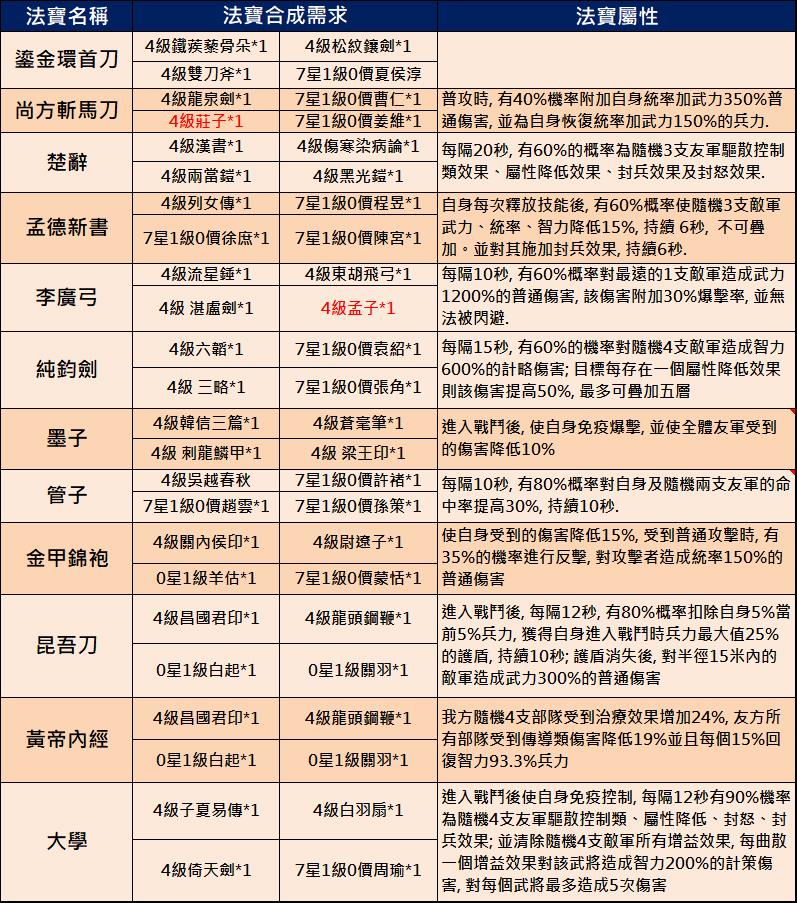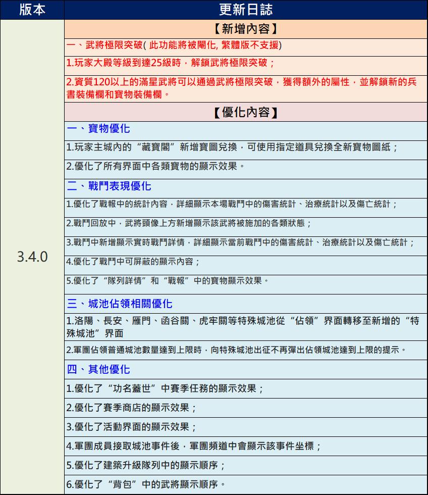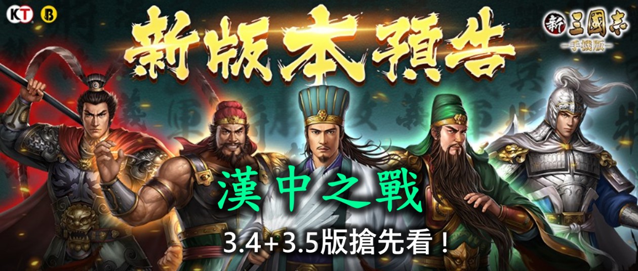 新三國志手機版官網於2022年1月11日在官方臉書釋出重磅消息,即將釋出3.4+3.5版! 不過,相較於陸版【三國志2017】,青鳥互娛考慮遊戲的平衡性,將原本武將「突破」系統剔除,導致許多早已囤積武將的玩家合成「金諸葛亮」、「金許褚」夢碎。不過,這次改版後藏寶閣將可以升級到第15級並可以製作新的寶書。這些新寶書需要許多武將、兵書..來合成,平民玩家可以趁升級前空檔趕快蒐集。 新三國志手機版3.4與3.5版改版哪些內容呢? 以下作一整理: 新三國志手機版3.4與3.5版改版後將迎來新寶物誕生、漢中之戰新玩法及多項遊戲內容優化。比較可惜是,原本玩家大殿等級到達25級時,將可解鎖原本資質120以上的滿星武將可透過武將極限突破,獲得額外的屬性並解鎖新的兵書裝備欄和寶物裝備欄的”突破”功能被遊戲公司以考量遊戲平衡性問題加以閹割刪除。 這次改版乃由陸版「三國志2017」的3.4版與3.5版一併改版而來,除武將突破功能被刪除外,其他內容新增與優化的更新內容如下: 目前改版時間未定,通常是一個月內,版主推測是27天後換國拜官之際。以下是新改版的內容,若官方有其他更新,將會及時更正(所有更新以官方公告為準,以下資訊僅供參考): 1.藏寶閣新寶圖兌換: 新改版後藏寶閣/黑市將開放升級到最高第15級,升級後將可合成製作新的寶物。藏寶閣/黑市所需升級資源如下: 升級後的藏寶閣將新增新寶物圖紙兌換入口,可使用武將、兵書、馬、裝備等道具進行兌換成新的寶物。 以下是新寶物需要的材料,若不想讓目前主力戰將融掉,請趁還沒改版前及升級藏寶閣空檔,趕快集滿所需武將或是兵書。其中,許褚、曹仁大多是平民一軍主將,請務必著手集滿七星。 2.新增漢中之戰: A.2軍團對抗2軍團形式: 活動將以2軍團V2軍團的形式進行,其中兩個軍團為曹操陣營,另外兩個軍團為劉備陣營。活動需由軍團長或副軍團長報名;報名完成後,將會為各軍團匹配盟友及敵方。 B.開啟視野,步步為營: 兩軍團初始只有大本營及外側的視野。視野外的區域不可見敵軍主城及行軍部隊,亦不可對建築物攻擊. C.搶中立建築物獲取增益及視野: 進入活動地圖後,兩個陣營的玩家需要搶佔各類中立建築,以獲取增益並解鎖視野,同一陣營共享相同視野。a.佔領定軍山大營、劍閣等可獲得【快速遷城】或【疾馳】增益 b.佔領角樓、大門、大營等解鎖對側視野,解鎖後方可遷城或出征至相應區域 D.獲勝方式: 最終攻陷兩個敵方大本營或活動結束時陣營積分高者獲得勝利: C.積分與獎勵: a.個人積分: 個人攻打敵方建築物那耐久度(漢中、角樓、東/西/南/北門、大本營..)都可獲得積分,活動結束依照軍團他貢獻度給與個人積分。 b.陣營積分: 陣營積分主要是用以判定陣營勝負的主要依據,主要透過攻打對方陣營的大本營耐久度來獲得,佔領漢水、定軍山大營、漢水大橋、劍閣、陽平關達到單位時長亦可獲得陣營積分。擊毀敵方大本營,將使敵營玩家喪失大本營的提供糧食增產,但仍可繼續戰鬥;擊毀兩個大本營,則活動提前結束。活動時間結束時,則以陣營積分高者獲勝。 c.漢中之戰獎勵: 玩家可依照活動積分獲得項羽或呂布拜官材料、騎術重置劵、蕭何/蒙恬/英布/彭越好感及專屬。 3.內容優化: A.護送馬商時間調整至周日22:00起 籌備階段:週一00:00-週日22:00 護送階段:週日22:00-23:05 結算時間:週日23:05 活動開放條件不變 B.騎術重置功能: 回收所新增【騎術重置】功能,重置需消耗道具。重置後,該武將所有騎術等級恢復為0級,並且返還100%的升級材料 C.平衡性調整: 張遼:拜官技能平衡性調整,拜官至前將軍且攜帶專屬寶物時,施放技能後獲得額外的韌性加成 關羽:拜官技能平衡性調整,拜官至漢壽亭侯且攜帶專屬寶物時,普通攻擊命中後對最近三支敵軍造成普通傷害的概率提高,傷害係數提高 D.寶物傷害類型調整 百里劍、紫電劍傷害類型由普通傷害改為 #普通連擊傷害 龍泉劍、松紋鑲劍傷害類型由計策傷害改為 #計策連擊傷害 E.戰報統計介面: 將增加詳細傷害、治癒數據,有助於更好瞭解當前陣容效果。 F.特殊城池頁簽: 佔領洛陽、虎牢關、函谷關、長安、雁門等特殊城池後,顯示在頁簽【特殊城池】內。 G.賽季任務顯示優化: 天下大勢-功名蓋世內,完成當前任務並領取獎勵後,將展示要求數量更大的後續任務 H.過關斬將不重置掃蕩記錄 I.地圖優化: 增加城池搜索;返回主城按鈕位置調整 J.陣容調整優化: 上陣武將時,取消自動裝備兵器 K.寶物圖鑒變動: 新增【專屬】、【追擊】分類。