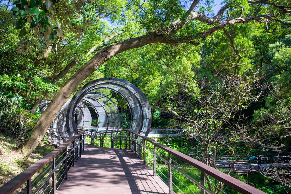 「虎頭山全齡友善步道」位於桃園區虎頭山公園內,始於綠林滿佈的奧爾森林學堂,沿著環山道路(三聖路)至桃信亭,全長 1.5 公里。球體鐵網造型是步道亮點之一,途中還有松鼠窩平台、鳥巢樹屋,運氣好的話能近距離邂逅出沒的山中動物與飛鳥;步道路線串接園內其他系統步道,可順遊孔廟、經國梅園、忠烈祠、明倫三聖宮等景點。全線坡棧道寬敞平緩,連輪椅、嬰兒車也可輕鬆推行,非常適合全家老小新年春遊出門踏青。