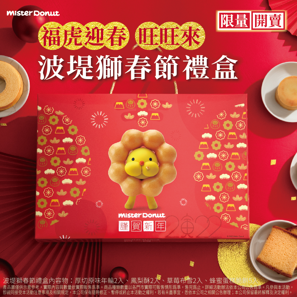 新春的腳步近了~SIS們是不是已經看到市面上有許多喜慶可愛的禮盒推出了呢~Mister Donut今年也以當家吉祥物波堤獅為主題來推出春節禮盒囉~