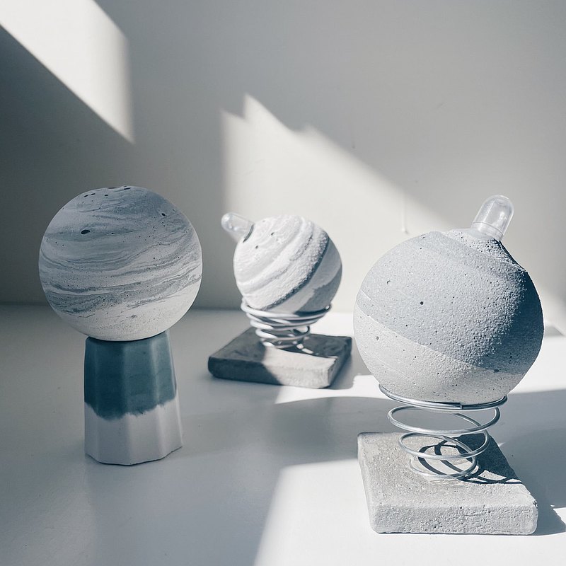 球體設計的花器,像是星球孕育出的新生命,水泥所呈現的紋理與氣孔,更貼近了行星原始的樣貌,除了作為花插擺飾,也可以當作紙鎮、擴香石或線香座,大款還可以作為書擋使用。水泥材質不適合大量盛水,適合搭配乾燥花草觀賞使用,直接在水泥表面滴上精油就變成了一款大面積的擴香石。