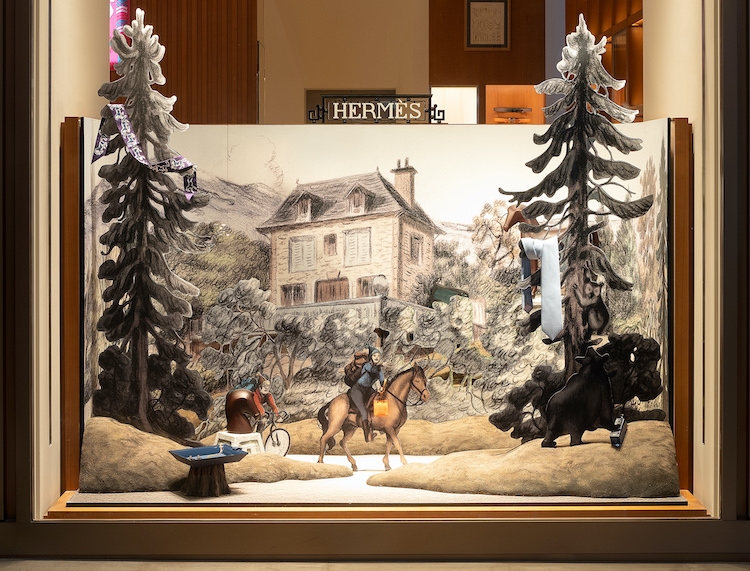 適逢新春團圓之時,這次 Hermès 攜手 Pierre Seinturier 合作的櫥窗設計,便是以兩位主角踏上家人團聚之旅的一趟冒險故事!插畫家以冬日的精緻為背景,在一樓的櫥窗陳列上,騎著馬與單車的兩人,以輕快的氛圍及步伐走過森林及山脈,到了品牌二樓,則是返家後的團圓時刻!在夜幕低垂的山嵐間,搭配上煙火燈飾,展現出歡樂、溫暖的氣息。