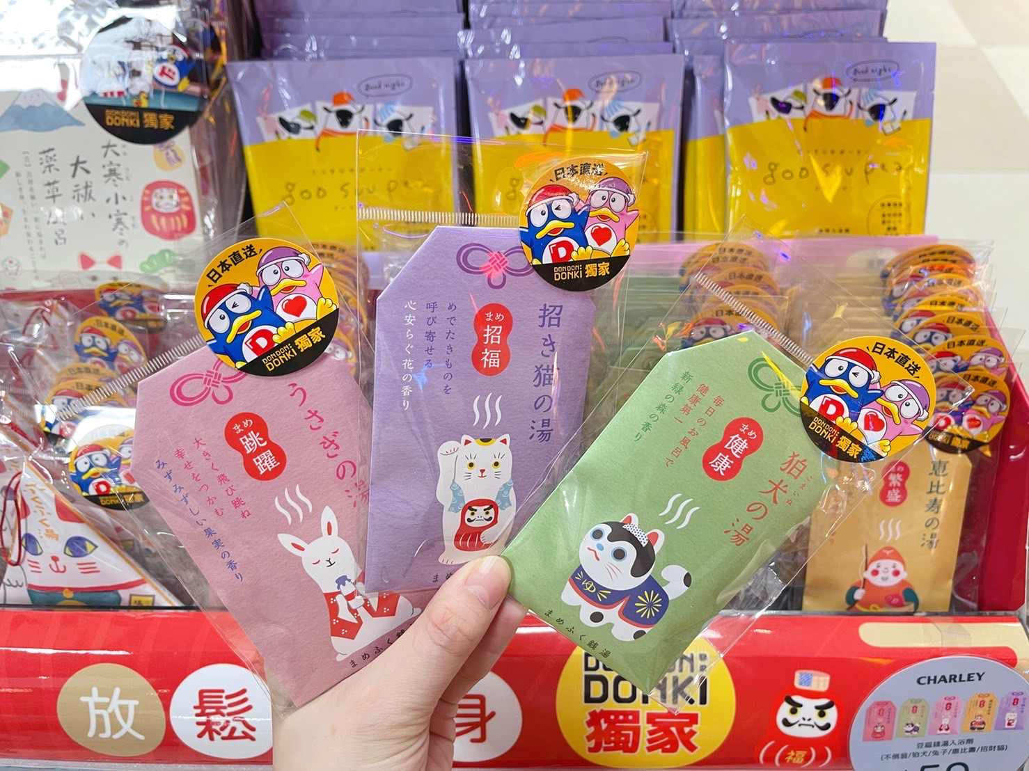 不能去日本泡湯享受沒關係,直接把來自日本的湯包帶回家,在家也能隨時享受泡湯的樂趣!這系列包裝超可愛,DON DON DONKI獨家販售的入浴劑,共有四款包裝可選擇,包含兔子、不倒翁、惠比壽、狛犬,特別設計成御守造型,也很適合當禮物送人。