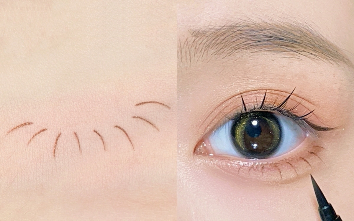 畫下睫毛一定要夠細緻,建議選擇已經用一段時間的眼線液筆描繪,才不會難以掌握出水量、或是剛畫完就暈開,而且眼線筆可以拉出非常細緻的線條,加上防水抗暈的效果,以眼線筆畫出的下睫毛更加持妝、不怕變成熊貓眼!