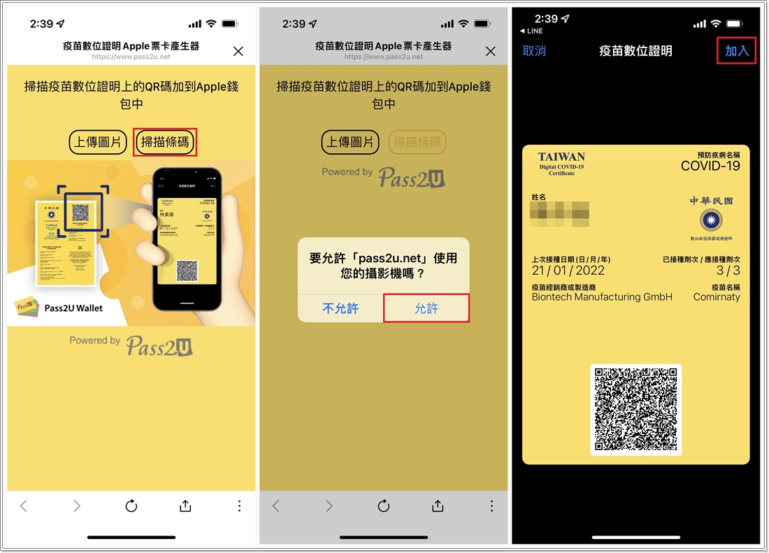 ▲按下「掃描條碼」並「允許」Pass2U Wallet 使用相機掃描 QR Code,待自動跳轉完畢之後再按下右上角的「加入」就完成囉!