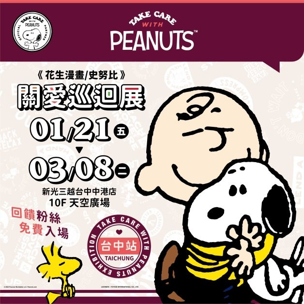 史努比展覽到台中了!去年「史努比關愛巡迴展」第一場在台北新光南西店登場時,吸引了許多粉絲前來朝聖,在粉絲極力敲碗下,第二站已於1/21進駐新光三越台中港店,台中的史努比粉絲們,終於也能一睹花生漫畫裡可愛的角色啦!