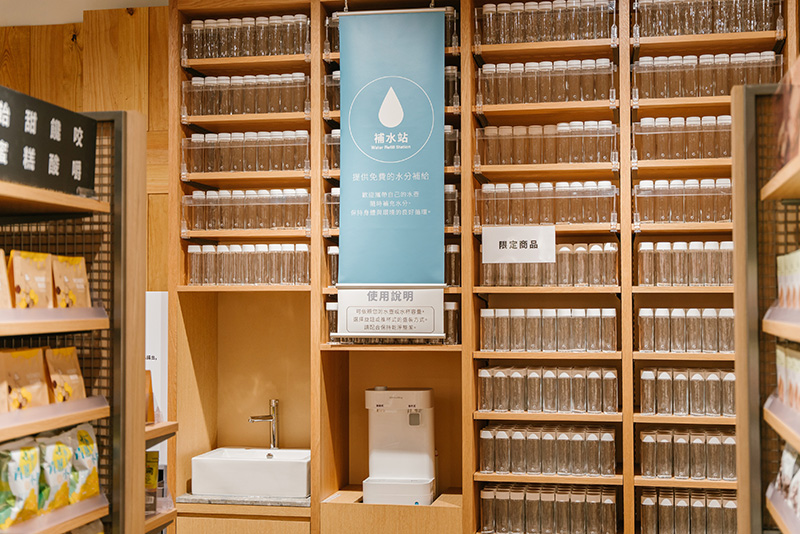 在日本無印良品常見的「免費飲用水提供站」,首次引進台灣也是獻給美麗華旗艦店。提供過濾飲用水,讓顧客可以直接裝取。同時也設計推出限定款玻璃水瓶,大瓶口的設計及250ml的容量,容易清潔且便於攜帶,可減少一次性容器的使用。不只有飲水機,還獨家帶來「MUJI POCKET」咖啡機,讓顧客在此閱讀或聊天時,享受研磨咖啡香。