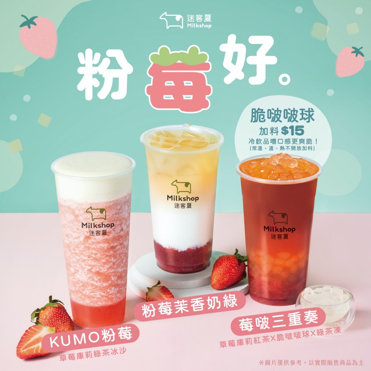 迷客夏以大湖香水草莓手作製成「草莓庫莉醬」,並用它當基底一口氣推出3款草莓飲品~首波主打「莓啵三重奏」,加入了娜杯紅茶與全新配料「脆啵啵球」,以及清爽的綠茶凍,打造多重口感;另外還有奶茶控必喝的「粉莓茉香奶綠」,與清爽草莓冰沙「KUMO粉莓」,鹹甜奶香KUMO奶霜升級整體滋味,妞妞們快一起喝起來。