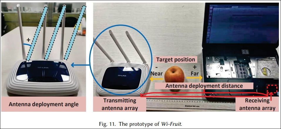 [caption id="attachment_424632" align="alignnone" width="591"]研究者利用一台筆電、一個具備 3 天線的 Wi-Fi 無限分享器,以及一塊具備 2 天線,採用 Intel 5300 晶片的無線網卡擔任接收器,組成了實驗用的原型機。分享器以 802.11n 模式運作,頻率為 5.24 GHz,頻寬為 40MHz。此外還利用智慧型手機的鏡頭替水果的外觀進行拍攝。