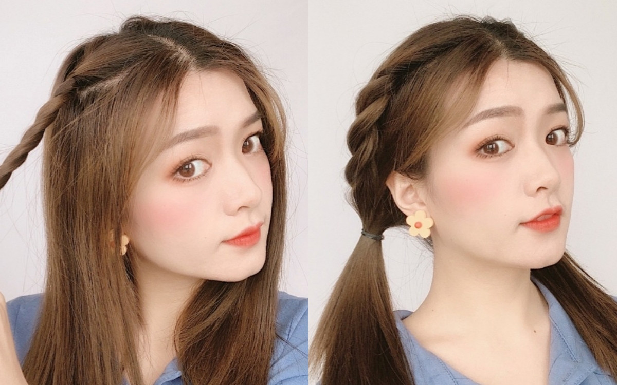 先從頭頂抓出兩股頭髮、將兩股頭髮扭轉成一束,往下扭轉時都加入一點下面的頭髮、直到扭轉到約耳下位置就可以直接綁起,另外一邊也是一樣步驟。