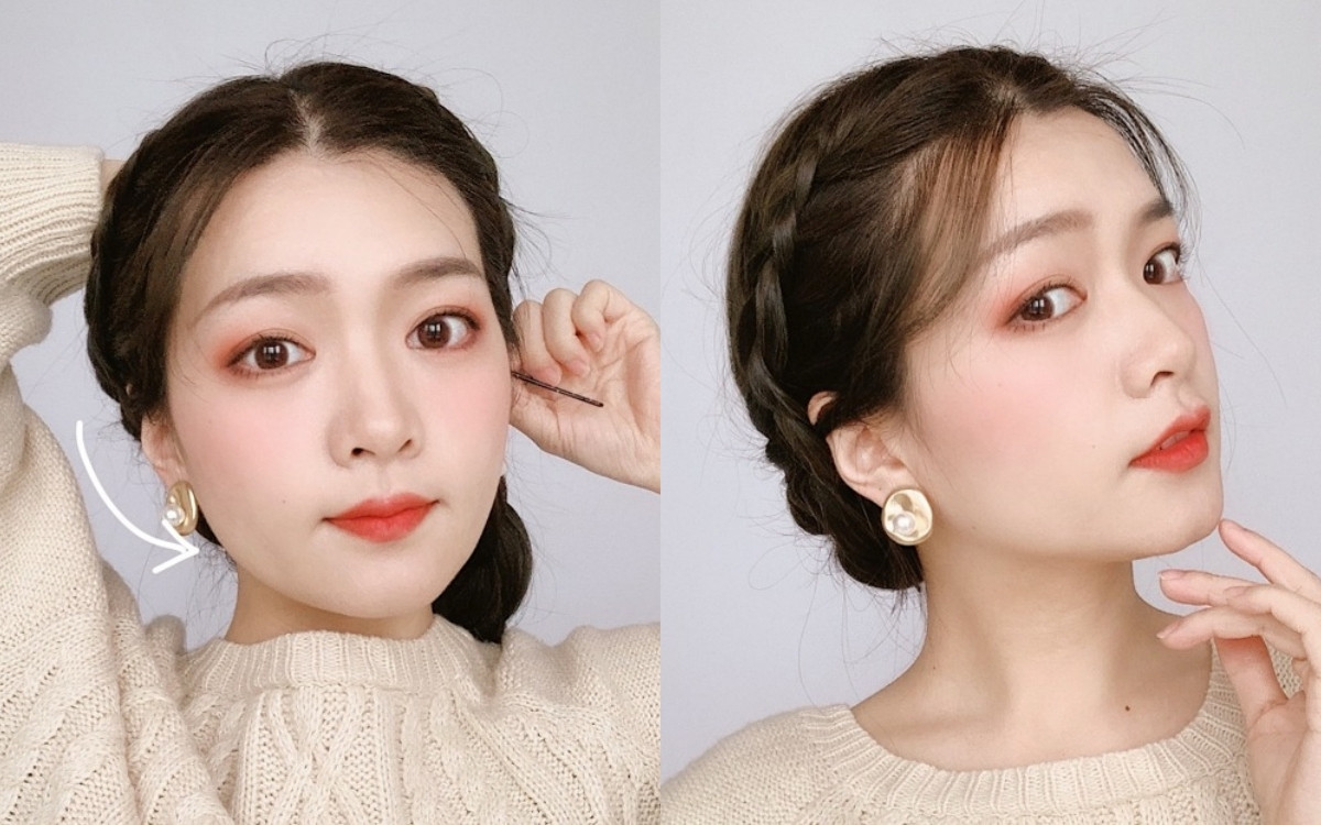 或是也可以再將兩條辮子分別向後、往反方向繞,接著用小黑夾固定變成盤髮,這款盤髮比較溫柔浪漫一點,也可以在搭配髮夾、髮帶等增加造型感,不易凌亂、鬆散的髮型也很推薦給機車族!