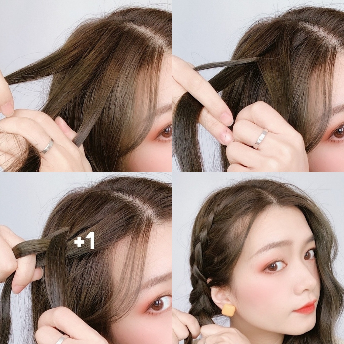 在頭頂取出一束頭髮後綁三股辮,往下每一股都加入下面的頭髮、變成貼在頭皮上的那種蜈蚣辮,直到將耳下頭髮全部綁成辮子。