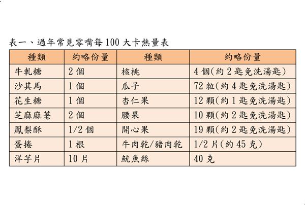 此外,糖尿病患者必須控制血糖與體重,應少吃糖果、餅乾類零食,腎臟患者需注意鹽分攝取,高血壓、心血管疾病患者則要避免食用高鹽、高油、高糖的食物,年節期間還是必須忌口,最好遠離魷魚絲、肉乾、蜜餞或油炸類的食物!表一為過年常見零嘴每100大卡熱量,若有吃到下列零嘴,約等於吃了1/3碗飯,因此需限制份量,才不會攝取過多的熱量喔!