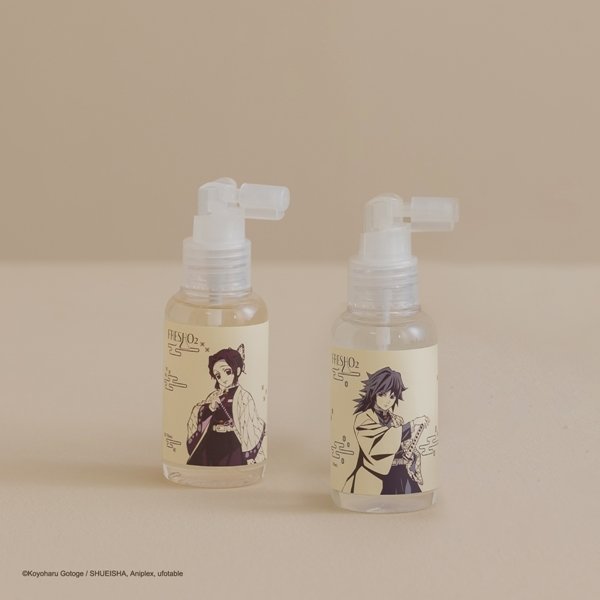 冨岡義勇の清新香氛噴霧(自然海洋調)搭贈惡鬼滅殺紙膠帶,自然的玫瑰花香搭配茉莉、鈴蘭、麝香,中性的百搭香味,清爽不刺鼻,以及胡蝶忍の清新香氛噴霧(清新果香調),搭贈惡鬼滅殺紙膠帶,清新的柑橘、檸檬香味,搭配桃子、無花果、雪松,甜美可人不甜膩,兩款香氣均含75%酒精,可針對衣物、空氣以及隨身進行清潔,同時帶來舒服清香,嚴選沉穩舒適香氛,不濃烈、不刺鼻。