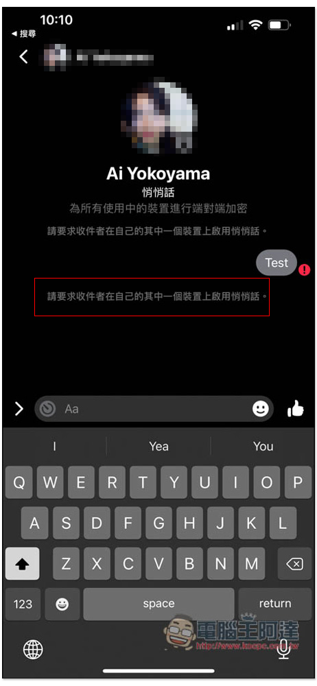 不過有一點要注意是,對方也必須啟用悄悄話功能才能開始聊天,只有單一方是沒用的,會出現 ! 錯誤訊息: