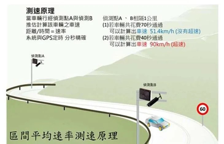「區間平均速率」指車輛行經某路段特定兩點之間(距離固定),除以所行駛的時間,即為平均速率。現行「雷達測速」也是偵測車輛在雷達波特定範圍內移動距離與時間差的關係計算車速(只是距離很短),一般認定是定點的測速,實際上也算是區間平均速率。