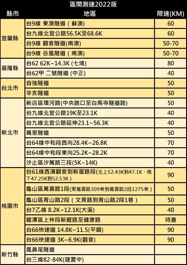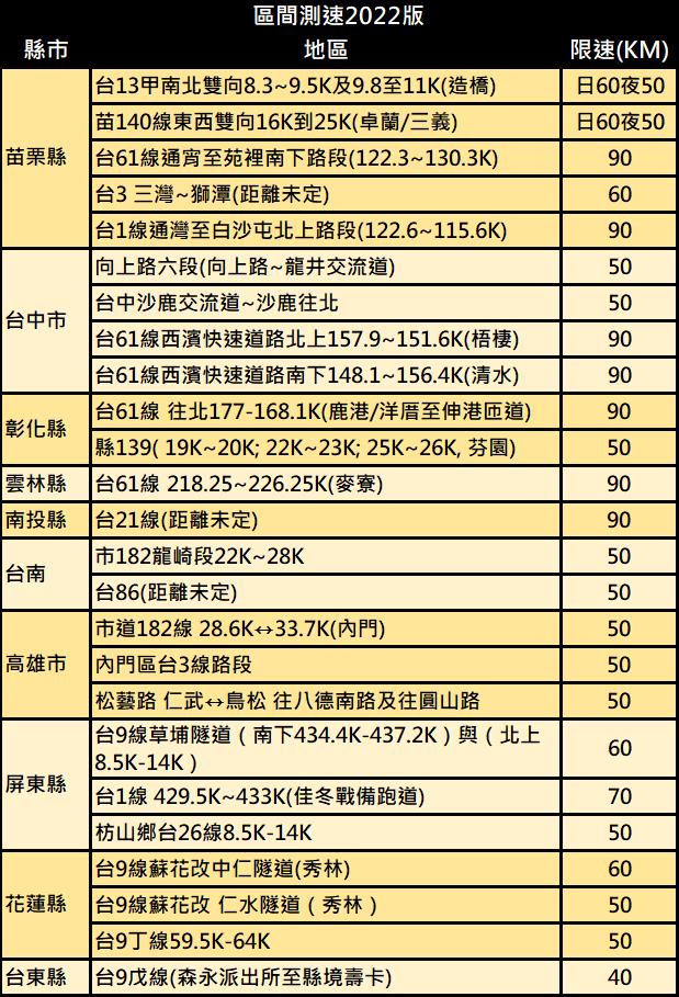 以下是將實施區間測速路段: