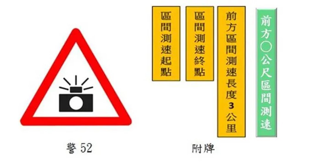 間測速大都使用在封閉或半封閉路段,且以常違規或易肇事的路段為主,實施區間測速的路段會設置「警52」警告牌面,一般道路設於起點前方100-300公尺(高快速公路為300-1000公尺),附牌文字為「前方區間測速長度○公里」。在實施測速路段內必須依速限規定行駛,因速率係以平均值認定,故偶然不慎超速應不至於立刻構成違規,後續再注意減速即可,亦即存有補救之機會(固定桿則無)。