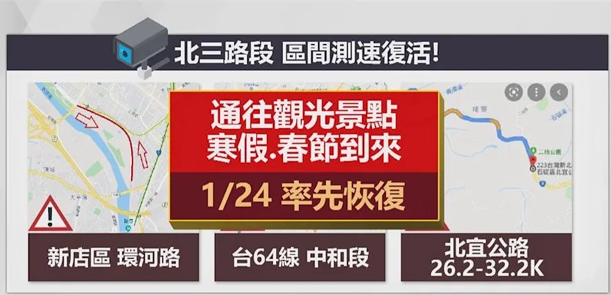為降低車禍事故,新北市率先宣布將在1/24日起優先在新店區環河路、台64線中和段及北宜公路26.2-32.2K,重啟區間測速。其中,北宜公路分析近10年事故數據,26.2-32.2K事故發生較多,爰規劃該段優先實施,其他路段易超速肇事地點則以固定式及移動式測速照相加強速度管理。
