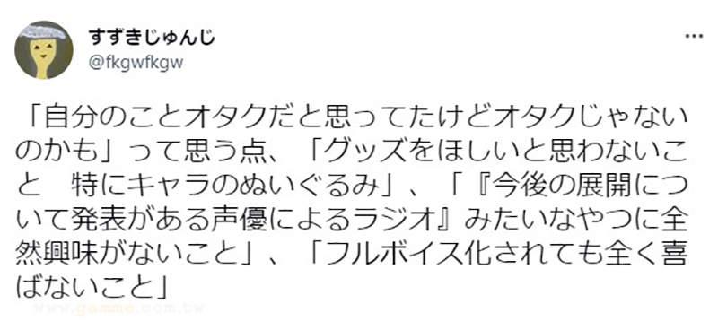 日前有一名暱稱すずきじゅんじ的日本推特網友上網發文,表示原來自己其實長期都誤解自己了,他原先一直認為自己算是個宅宅,對於動漫及漫畫都有一定程度的理解,但是仔細追究下去,會發現自己好像宅得不夠專業?舉凡是收集周邊商品,或是追聲優廣播節目等等「宅宅應該要去做的事情」,他卻完全不感興趣。