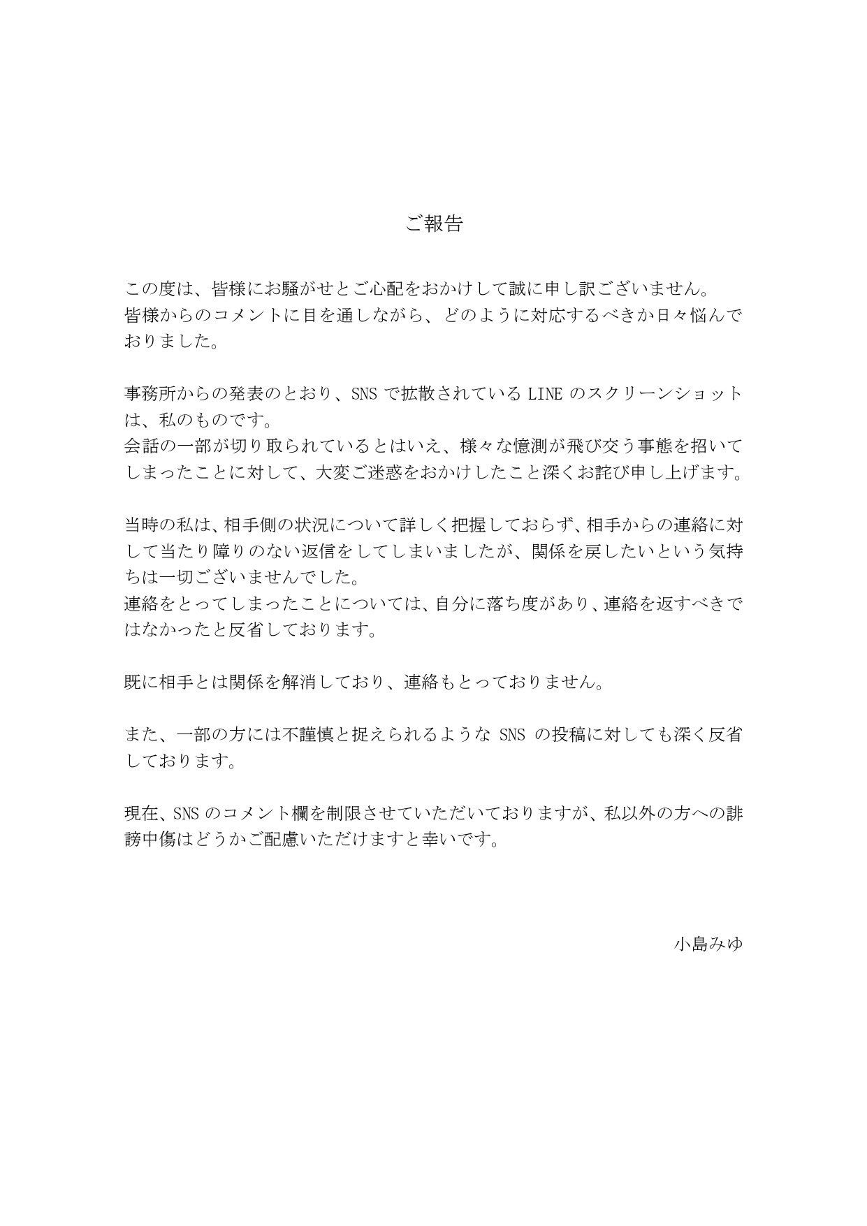 因此小島美優通過公司發聲明坦承曾經與前山交往過,不過就否認插足倆人的感情,並說在去年9月之後兩人就沒有任何關係了。同時她也承認有與前山互傳訊息,不過並不是為了復合,請大眾不要亂猜測。