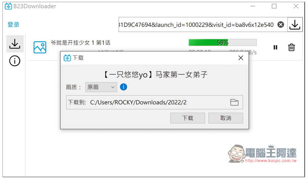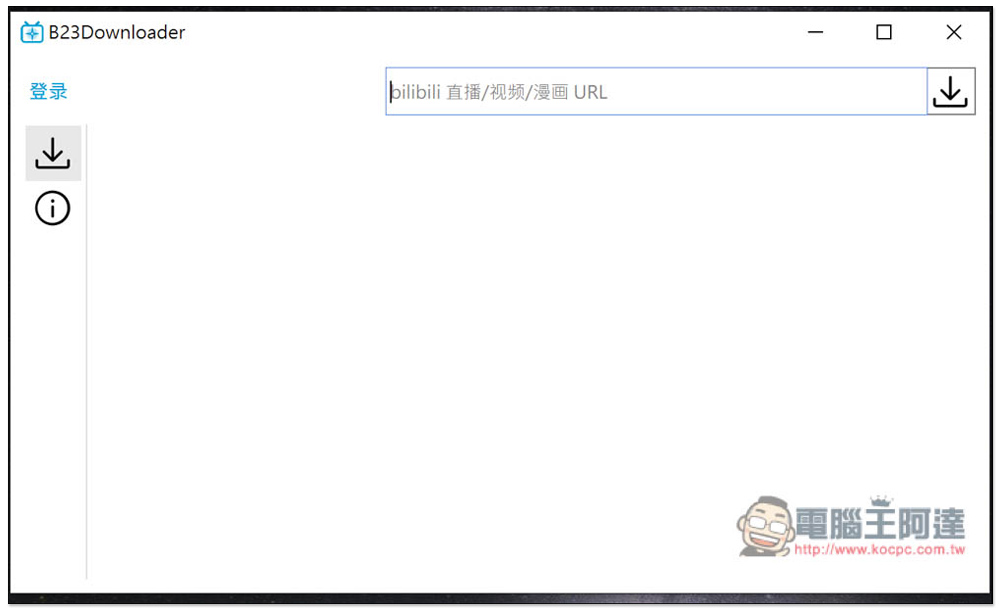 B23Downloader 介面設計非常簡單,就只有下載功能,打開後把你要下載的 bilibili 網址貼上。如果你想下載會員專屬內容,左邊登錄你的帳密就可以: