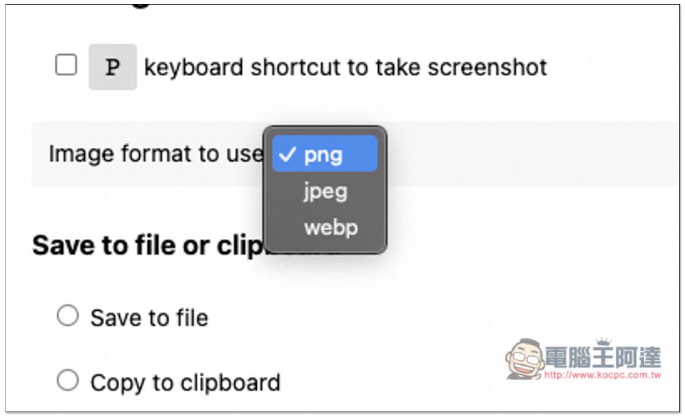 截圖格式預設為 png,也提供 jpeg 與 webp,有需要的人可以更改: